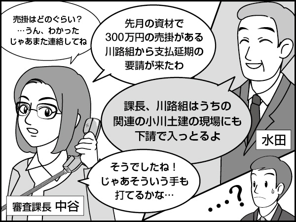 「横須賀の川路組から支払延期の要請が来たの。うちも先月の資材で300万円の売掛あるんだけどな」