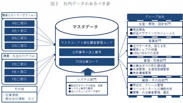 社内データのあるべき姿とは、マスタデータを主体としたデータウェアハウスを構築し、最新かつ正しい状態を維持することで「グループ内のすべての企業」かつ「すべての部署」で情報を最大限に活用できる状態です(図2)。