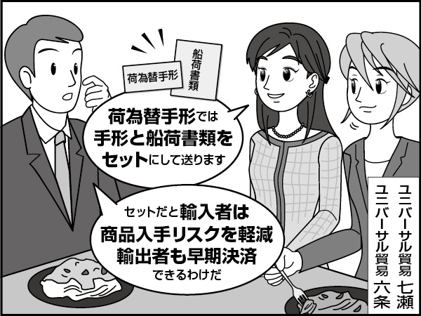 「荷物との交換に必要な船荷証券がセットなら、輸入者は商品の入手リスクも軽減できますね。輸出者も、手形だから早期決済が行えるわけだ」
