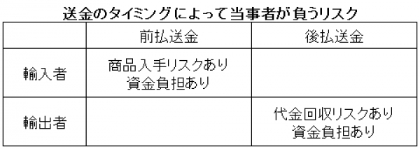 「逆に支払いが商品到着後のときは、輸入者は楽になるけど、輸出者が代金回収リスクを負うことになるから、結局どっちかがリスクをとる取引になりますね」