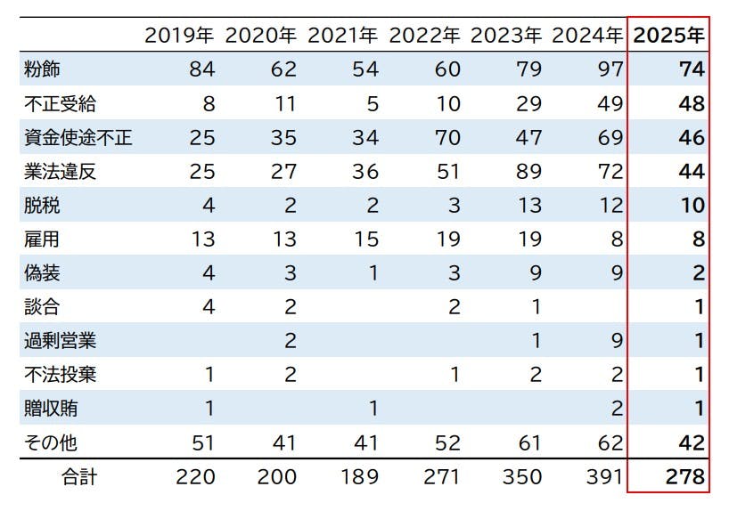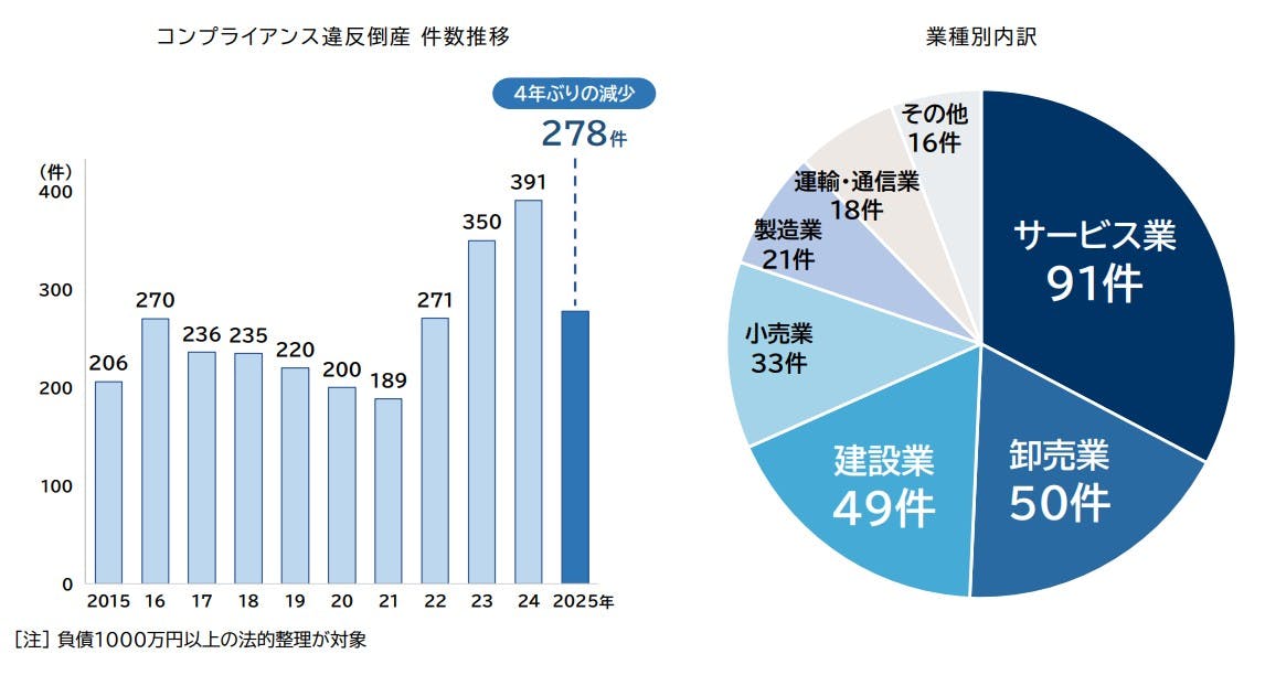 意図的な法令違反や社会規範・倫理に反する行為を原因とした「コンプライアンス違反」倒産(法的整理、負債1000万円以上)は、2025年に278件発生した。前年(391件)から113件、28.9%減少し、4年ぶりに前年を下回った。