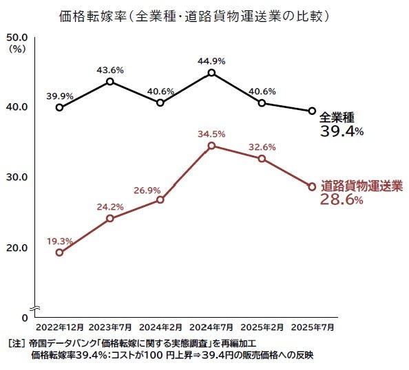 今年7月に帝国データバンクが実施した「価格転嫁に関する実態調査」によると、コスト上昇分の販売価格への転嫁度合いを示す「価格転嫁率」は全業種で39.4%となり、2年半ぶりに4割を下回った。特に、人手不足倒産が急増した道路貨物運送業では28.6%と、全業種と比較して10ポイント以上低い水準にある。足元では人件費に加えて原材料やエネルギーなどあらゆるコスト高騰に直面しているが、それを運賃に転嫁することは容易ではなく、「人件費や資材等が値上がりしており、利益確保が難しい」といった、苦しい経営状況が聞かれている。
