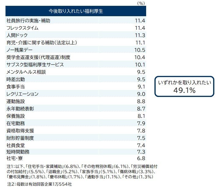 今後いずれかの福利厚生を取り入れたい企業は約半数、