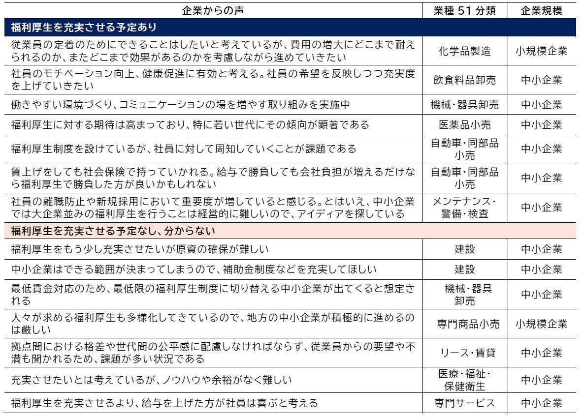 一方、「予定はない」企業からは、「福利厚生をもう少し充実させたいが、原資の確保が難しい」(建設)や、「経営側・従業員とも福利厚生の充実より賃上げが優先と考えている」(建材・家具、窯業・土石製品製造)といったコメントが寄せられた。