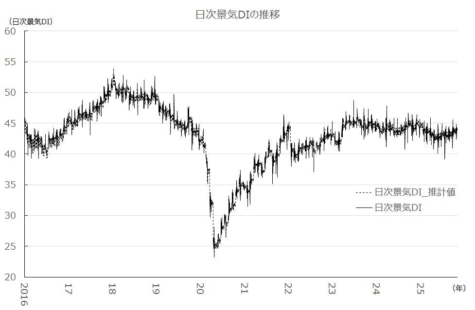 • TDB景気動向調査から得られる日次景気DIの欠測値を状態空間モデルで補完し、2014~2025年の連続系列と95%予測区間を構築した。