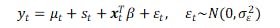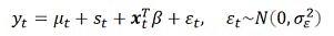 で与える。ここで yt は日次の景気DI、μt は潜在レベル、st は週内季節(周期7)、xt は外生ベクトルである。本件では