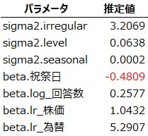 株価・為替の対数リターンは短期の市況ショックに対する景況感の敏感度を捉え、当日の変動を推計へ取り込む。回帰モデルの係数表は、UCMにおける外生効果の直観整合性を手元で素早く点検する補助線として役立つ。