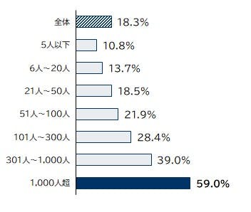 本調査によると、日本企業の海外進出率は18.3%、コロナ禍やウクライナ情勢など地政学的リスクの高まりを受け、2019年比で6ポイントも落ち込んだ。不確実性の増大が企業マインドの低下を招いていると考えられる。一方で、1,000人超の企業では進出率は6割近くに達し、企業規模による二極化が目立った。