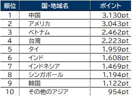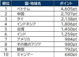 [2] 各国・地域のポイントは、調査の際に検討の可能性がある国・地域について1位〜3位までの順位を付けた回答の結果に基づいて集計したものである。順位ごとにポイントを付与し、1位は5pt、2位は3pt、3位は1ptとして、合計ポイントを算出した