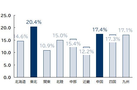 地域別では、「東北」(20.4%)が唯一2割を超え、都道府県別でも1位「福島県」(24.5%)、2位「宮城県」(21.7%)、3位「岩手県」(21.2%)と上位を占めた。依然として、東日本大震災後の各種金融支援策の影響もあり、震災から間もなく15年を迎える今も借り入れ負担が重い企業が多いと考えられる。他方、「関東」(10.9%)が最も低く、「近畿」(12.2%)が続いた。とりわけ「東京都」は8.8%となり、都道府県別で最も低い水準だった。