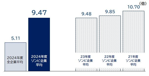 「有利子負債月商倍率」をみると、2024年度のゾンビ企業平均は9.47倍だった。同指標は徐々に減少しているものの、依然として過大な債務を抱えている。全企業平均(5.11倍)と比較し、2倍近くにのぼり、また、資金繰りを支えるために借入依存度が高まった企業では、金利負担増が収益を圧迫する悪循環に陥っている。改善傾向が見られるものの過剰債務状態の解消には一定の時間を要している。