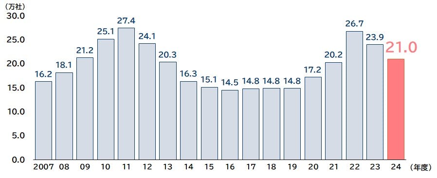 2024年度のゾンビ企業率14.3%を、帝国データバンクが保有する企業概要データベース「COSMOS2」収録の約147万社を母集団として当てはめると、2024年度の全国のゾンビ企業数は約21万社と推計された。