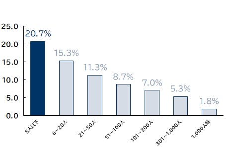 従業員数別では、「5人以下」(20.7%)が最も高く、唯一2割を超えた。以下、「6~20人」(15.3%)、「21~50人」(11.3%)が続いた。企業規模が大きくなるにつれて、ゾンビ企業率が低下し、「1,000人超」(1.8%)が最も低かった。