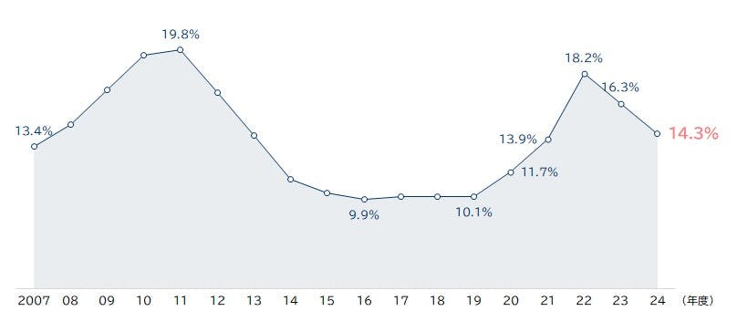 国際決済銀行(BIS)が定める「ゾンビ企業」の定義である「3年連続でインタレスト・カバレッジ・レシオ(ICR)が1未満、かつ設立10年以上」の定義に基づき、2024年度のゾンビ企業率を算出した。帝国データバンクが保有する企業財務データベース「COSMOS1」(2025年11月末時点)において、2024年度の財務データが判明している「3年連続でICRが判明、かつ設立10年以上」の企業は11万9,027社あった。このうち、「3年連続でICRが1未満、かつ設立10年以上」の企業は1万6,966社を数え、この2つの数値をもとに全国のゾンビ企業率を計算すると14.3%と試算された。直近 では、2022年度の18.2%をピークに2年連続で減少した。
