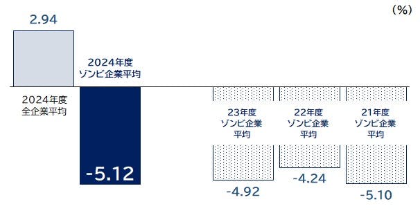 企業の安定性を示す「自己資本比率」をみると、2024年度のゾンビ企業平均はマイナス9.27%となった。債務超過額の拡大が進み、全企業平均(29.49%)と比べると、ゾンビ企業の財務内容は会社経営の安定性で、大きく見劣りしたままの状態にあることが分かる。