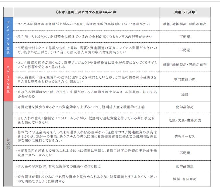 一方で、「金利が上がりお金が回れば、売り上げ・利益の増加、設備投資につながり、物価も緩やかに上昇しながら、力強い賃金上昇につながっていく好循環に転じると期待したい」(建設)、「日米の金利差が是正されれば、円が上がり原油や輸入品の価格が下がることが期待される」(機械・器具卸売)など、過度な円安の是正を期待する声も多く寄せられた。
