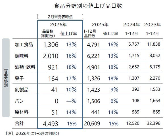 2026年の値上げは、1~6月までで累計4493品目となり、年間の平均値上げ率は15%に達した。年間の値上げ品目予定が1万品目を超えていた前年同時期(2025年2月28日時点、1万797品目)に比べ、2026年2月時点では予定を含めて5千品目に届かず、前年比6割減ペースでの推移となった。ただ、菓子類などで「減量値上げ」が散見されるほか、値上げ商品を選別する動きもみられる。また、コメの価格高騰を中心に、米菓などコメを原料とする飲食料品では値上げ圧力が根強いほか、すり身、アフリカ豚熱の影響を受けた豚肉類など、関連する食料品で「原材料高」による影響を受けた値上げが一部でみられた。ただ、全体では総じて値上げの動きが鈍化傾向にあり、単月で1千品目を超えるのは6月までで4月のみ(2516品目)にとどまった。