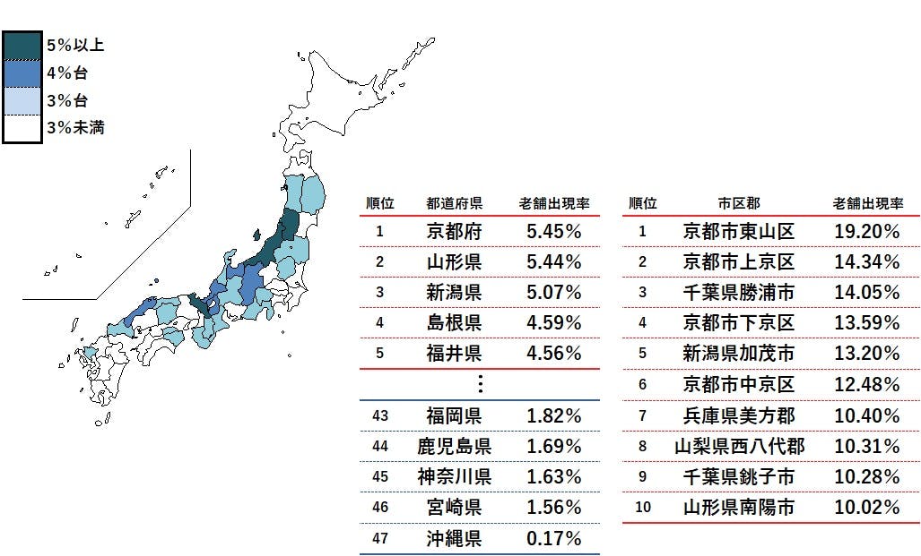全国の老舗出現率を都道府県別にみると、京都府が5.45%でトップだった。古都として栄え、第二次世界大戦中の被害が比較的小さかったことが老舗企業の存続につながっていると考えられる。「酒どころ」の山形県、新潟県が続き、3府県が5%を上回った。そのほか、日本海側の地域を中心に5県が4%を上回り、全体の3.11%を上回ったのは23府県だった。