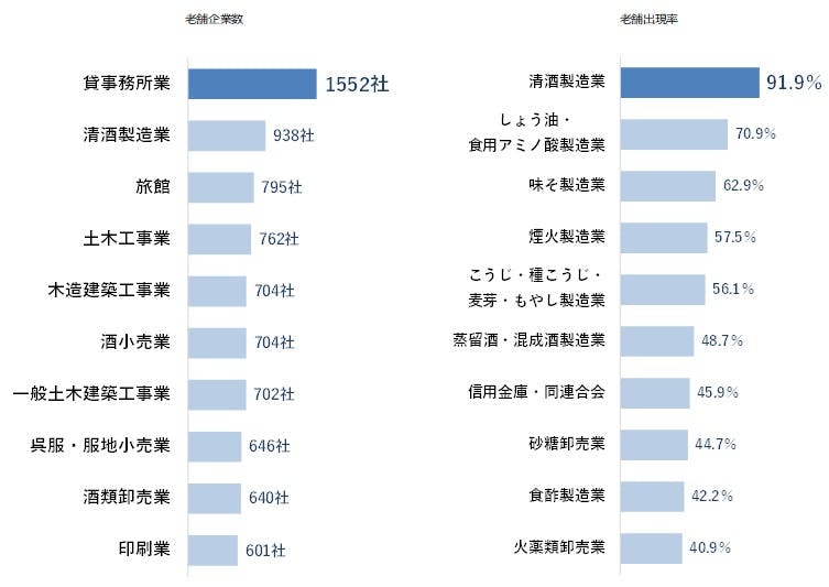 老舗出現率でみると、清酒製造業が91.9%と9割を超えた。そのほか、しょう油・食用アミノ酸製造業や味そ製造業など醸造系の業種が上位に来ている。また、花火や産業用の火薬を取り扱う煙火製造業や火薬類卸売業の老舗企業割合が高い。