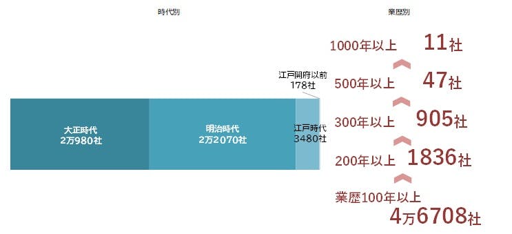 業歴100年を超える老舗企業は4万6708社となり、老舗出現率は初めて3%を超えた。老舗企業の9割が明治・大正時代に創業・設立した企業で、江戸時代以前に創業した企業は約3600社に限られる。