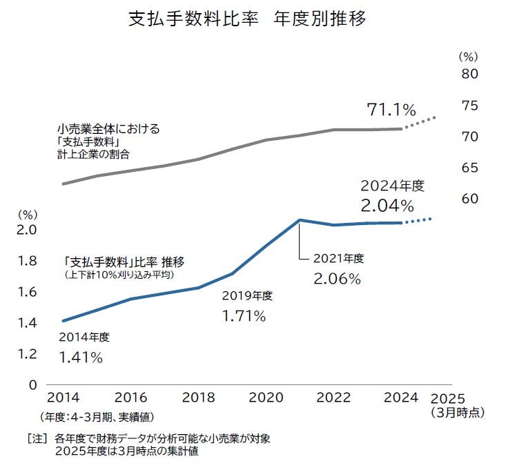 実際に支払手数料を計上する小売企業も増加し、2022年度には初めて1万社を超えた。2024年度時点では、分析可能な小売企業全体の約7割を占めた。2025年度は確定していない企業が多いものの、集計可能な約4千社で「支払手数料」比率は2.07%と、過去最高水準で推移している。