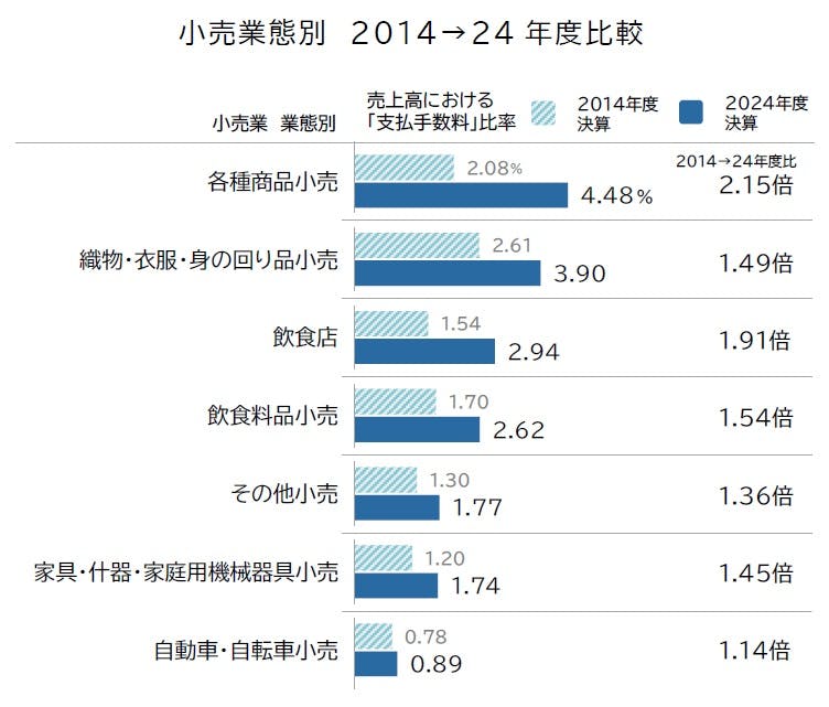 アパレルを中心とした「織物・衣服・身の回り品小売」も全業種の中で高水準となっており、2014年度の2.61%から2024年度には3.90%へ上昇した。キャッシュレス決済手数料に加え、自社ECサイトを持たない中小企業を中心に、大手ECモールへの出店手数料や販売代行手数料が、売り上げ確保に不可欠なコストとして重くのしかかっている。