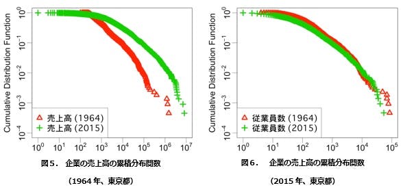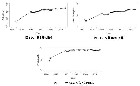 さらに、1964年に存在した企業で、2015年も存在が確認できた2,192社を分析してみたところ、生き残った企業は、売上高が大きく増加しても、従業員数に大きな変化はないという特徴がわかりました。