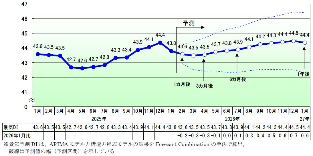 2026年1月の景気DIは前月比0.6ポイント減の43.8となり、8カ月ぶりに悪化した。国内景気は、年末商戦や旅行需要の反動が表れ、改善基調のなかでいったん足踏みとなった。