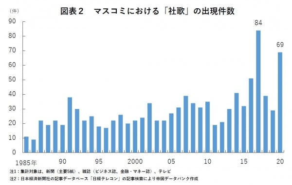 こうした動きはマスコミにおける「社歌」の出現件数にも表れています。2017年は、社歌コンテストの盛り上がりがテレビを中心に年間84件取り上げられました(図表2)。また、2020年は年間69件取り上げられましたが、その背景として、社会全体を覆った新型コロナウイルスの影響がありました。在宅勤務であっても従業員のコミュニケーションを積極的に行う手段として「社歌」が再評価されることになったのです。そこにはビデオ会議システムの拡がりも重要な役割を果たしていました。