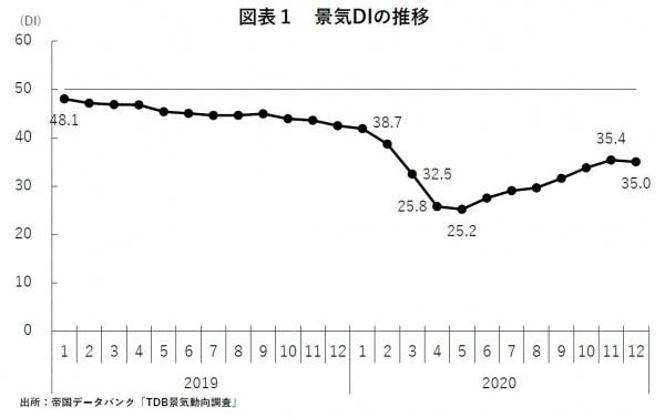 その後は、緩やかな持ち直し傾向が表れていましたが、12月に入ると、新型コロナウイルスの感染再拡大にともない、観光支援の各種施策が全国的に一時停止されたことなどが悪材料となり、景気DIは7カ月ぶりに下落するという状況となっています。さらに、冬季賞与の減額や新型コロナウイルスに関連した失業者の増加など所得環境が悪化したほか、一部地域での休業・営業時間短縮などで、小売や個人向けサービスなど個人消費の落ち込みがみられました。