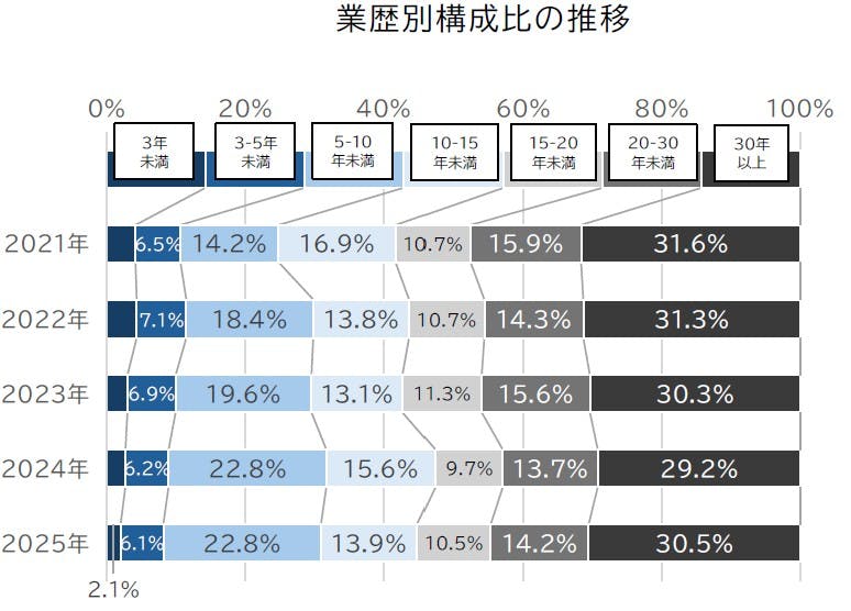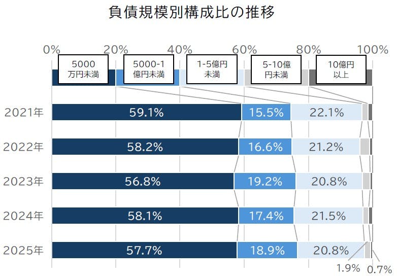 業歴別にみると、構成比が最も多いのは「30年以上」で全体の30.5%(617件)を占め、近年はおおむね3割程度で推移している。一方で、増加基調にあるのは「5-10年未満」で、2025年は構成比22.8%(460件)となり、2021年比では8.6ポイント上昇している。創業間もない時期にコロナ禍を経験し、経営体制の整備や財務面の蓄積が進まないなかで、物価や人件費の急騰にさらされ支え切れなくなった業者が多いとみられる。