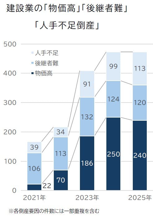 個別の倒産要因を分析すると、人手不足を直接的な要因とした「人手不足倒産」は、前年の99件から113件に増加。「物価高倒産」は240件と、鋼材や木材価格の上昇に一服感が出たこともあって前年(250件)を下回ったものの、200件を大きく超え、過年度に比べて高水準で推移している。また、「経営者の病気、死亡」を主要因とした倒産も78件判明。前年の77件を上回り、2000年以降で最多となった。『全国「社長年齢」分析調査』(2025年3月、帝国データバンク)によれば、建設業における社長の平均年齢は60.3歳(2025年3月時点)と全体平均(60.7歳)を若干下回っているが、1995年比では+6.1歳と高齢化の度合いは「不動産業」(+6.3歳)に次いで2番目に大きい(全体平均は+5.3歳)。建設業就業者の高齢化が叫ばれて久しいが、倒産に直結する経営者の高齢化への対応も課題だ。
