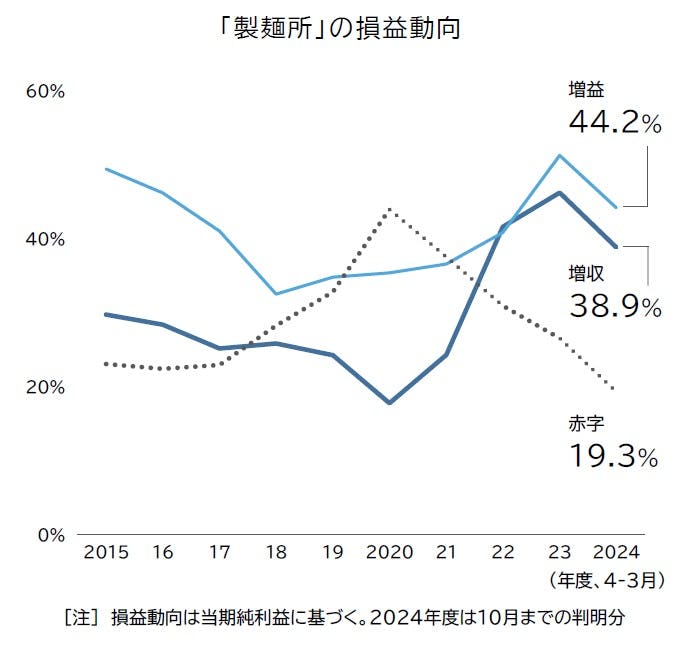 製麺所における2024年度の業績動向をみると、前年度から売り上げを増やした「増収」企業の割合は38.9%だった。過去20年で最も高かった2023年度(46.3%)に比べると見劣りするものの、4割に迫る水準を維持した。利益面でも、利益を増やした「増益」が44.2%を占め、過去20年で2番目に高く、利益を確保できなかった「赤字」(19.3%)は同最少となるなど、業況の大幅な改善がみられた。