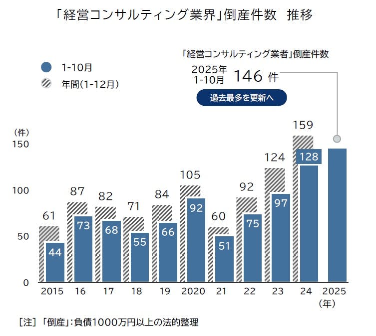 2025年1-10月に発生した「経営コンサルティング」業者の倒産(負債1000万円以上、法的整理)は146件となった。集計を開始した2000年以降で最多だった前年(159件)を上回るペースで推移しており、年間で過去最多の更新が確実とみられる。特に、資本金「1000万円未満」の割合が8割超を占めるなど小規模な事業者で淘汰が続き、規模の拡大が続く中堅・大規模ファームとの格差が広がっている。