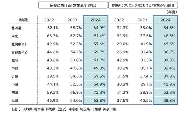 地域別にみると(病院本部の所在地)、2024年度の病院経営で最も営業赤字の割合が高いのは「四国」(72.3%)で、全体の7割を占めた。次いで「北陸」(71.7%)、「北海道」(64.9%)、「九州」(63.8%)と続いた。最も低いのは「中部」(49.3%)で、5割を下回る水準だった。