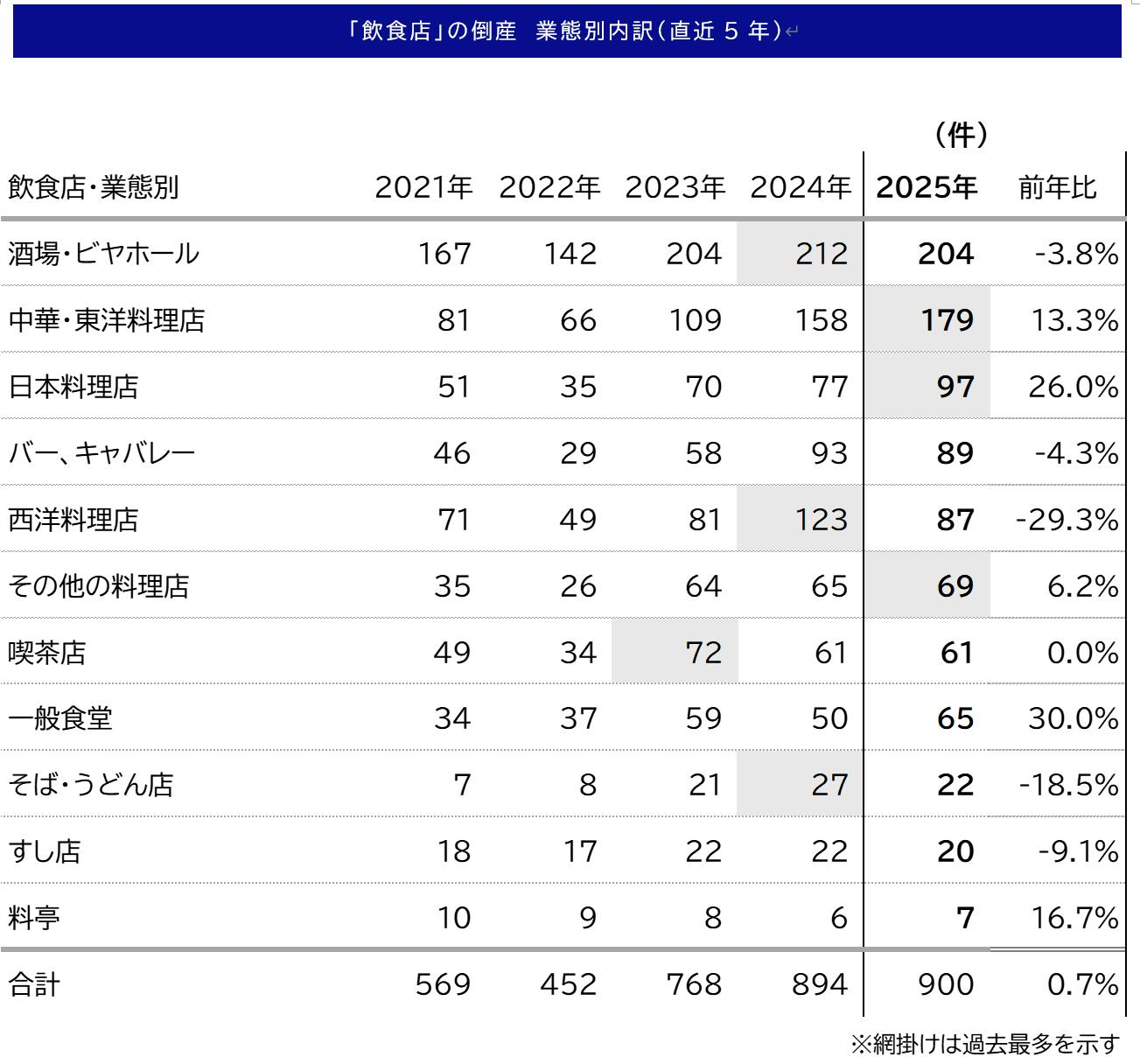 2025年の「飲食店」倒産、過去最多の900件。3年連続の増加