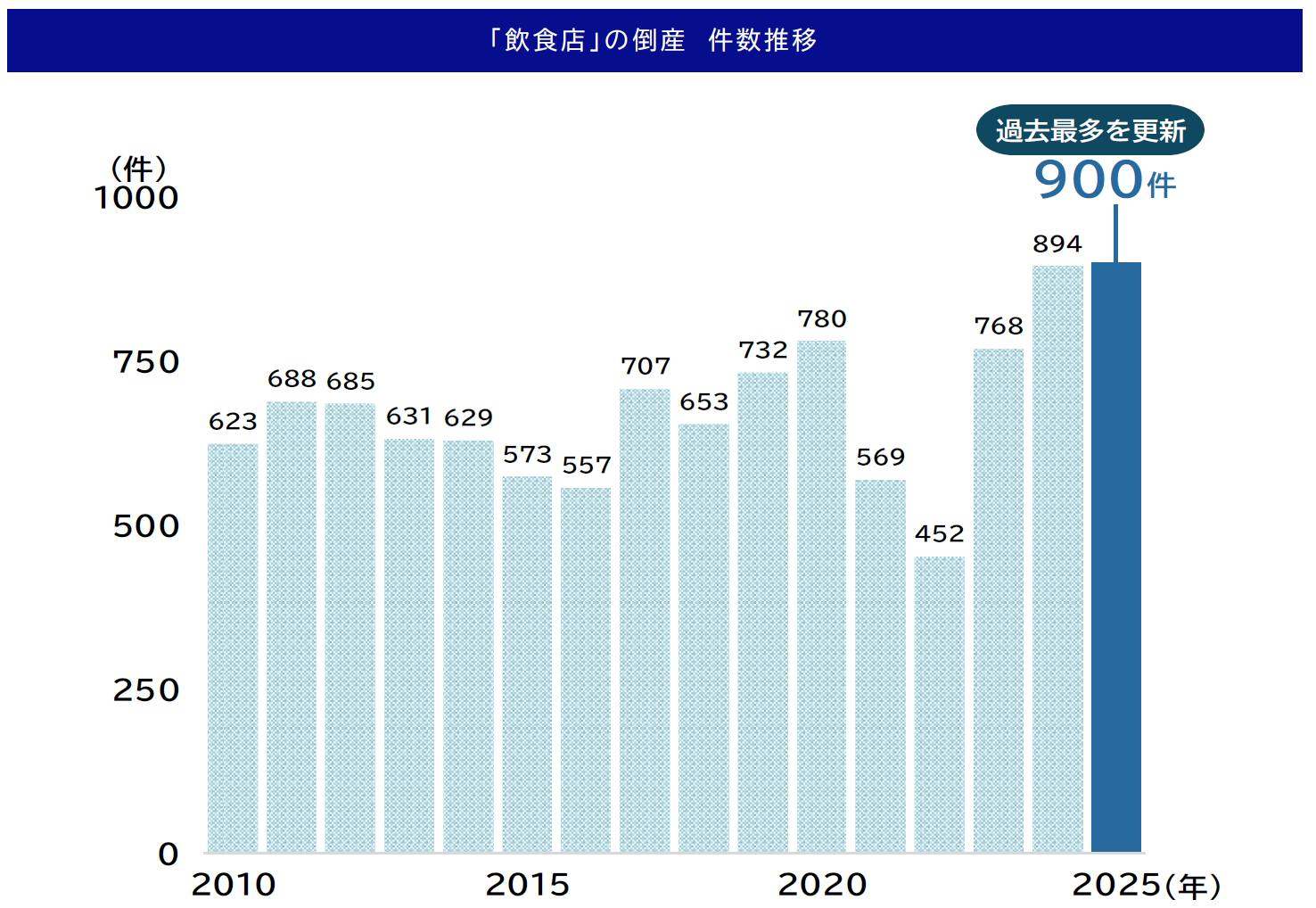 2025年飲食店経営事業者の倒産(負債1000万円以上、法的整理)は900件となり、前年(894件)から0.7%・6件増加。過去最多を記録した2024年(894件)を上回って過去最多を更新した。