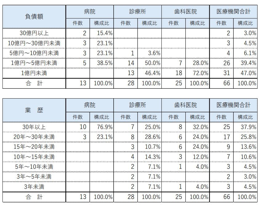 負債額別では、「1億円未満」が31件(構成比47.0%)で最も多く、「1億円~5億円未満」(26件、同39.4%)、「5億円~10億円未満」(4件、同6.1%)が続き、1件当たりの平均負債額は「病院」が13億8800万円、「診療所」が1億6900万円、「歯科医院」が5700万円となった。