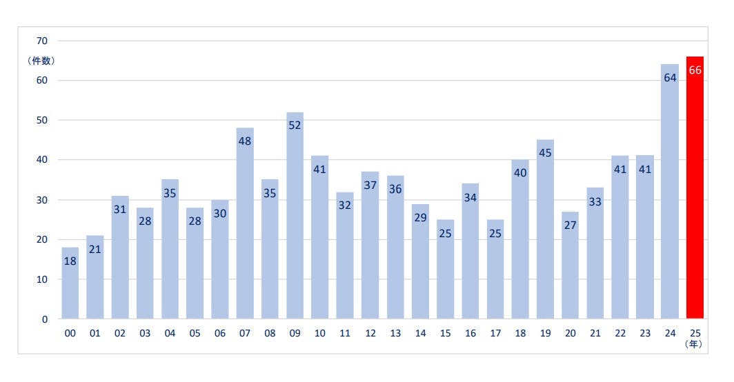 2025年の医療機関(病院・診療所・歯科医院を経営する事業者)の倒産(法的整理、負債1000万円以上)は66件となり、最多だった2024年(64件)を上回って過去最多となった。