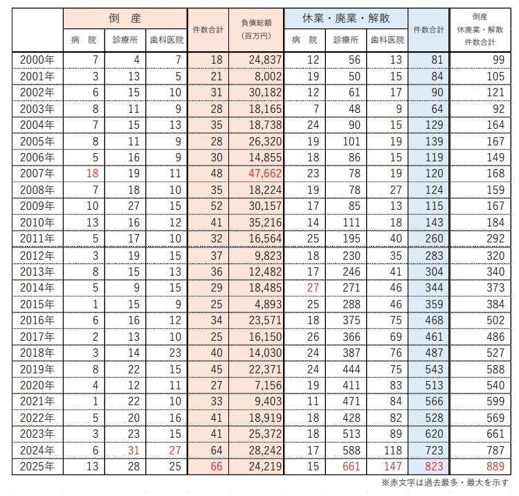 2025年の医療機関の倒産件数(66件)、休廃業・解散件数(823件)は、ともに過去最多を更新し、倒産、休廃業・解散の合計は889件に達した。