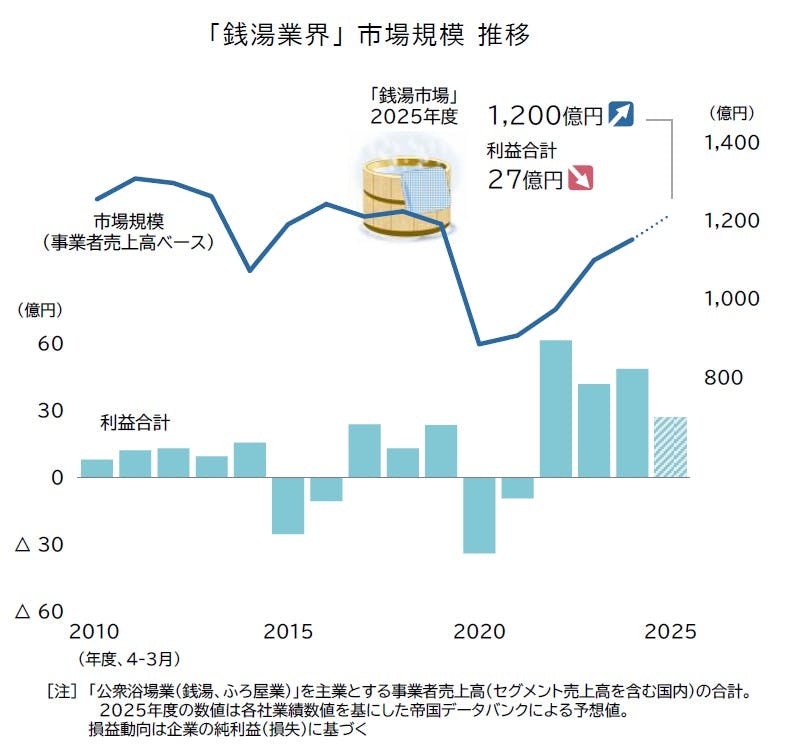 銭湯業界はサウナブームを背景に市場規模が拡大し、2025年度の売上高は1200億円前後と、コロナ禍以降で最高水準となる見通し。一方、原油価格や人件費の高騰により収益環境は悪化し、2024年度は4社に1社が赤字、2025年度の利益水準も前年度から半減した。価格転嫁の制約が大きいなか、燃料費高騰が続けば、経営体力の弱い銭湯を中心に廃業リスクが一段と高まりかねない。