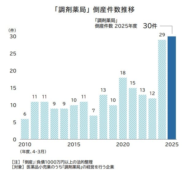 2025年度に発生した「調剤薬局」の倒産(負債1000万円以上、法的整理)は30件にのぼった。前年度の29件を上回り、2年連続で最多を更新した。このうち8割超が資本金1000万円未満と小規模。特に、大手ドラッグストアの進出や、近隣の病院・クリニックの閉院といった影響を強く受けた「門前型」の調剤薬局で苦境が鮮明となっている。